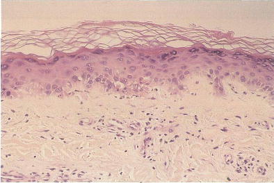 54歳の男性。全身の皮疹と倦怠感とを主訴に来院した。1か月前から顔面,体幹および四肢に紅斑が出現し,徐々に拡大し,全身倦怠感を伴ってきた。上眼瞼と四肢関節の背面とを中心に紅斑がみられる。膝部の写真と同部の病理組織H-E染色標本とを別に示す。