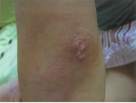 5歳の女児。3週前から両頬部に紅斑が出現し,2週前から全身倦怠感も出現してきたため来院した。身長 125cm,体重 24.5kg。体温 36.8℃。脈拍 88/分,整。血圧 120/68mmHg。顔面の紅斑の写真と肘頭の皮疹の写真とを別に示す。眼球結膜と眼瞼結膜とに異常を認めない。心音と呼吸音とに異常を認めない。腹部は平坦,軟で,肝・脾を触知しない。四肢の筋力低下が認められ,ベッド上では仰臥位から直接立ち上がれない。心電図と胸部エックス線写真とに異常を認めない。