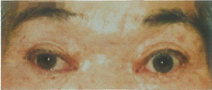 現症: 意識は清明。身長 158cm,体重 56kg。体温 36.2℃。脈拍 72/分,整。顔面の発汗に左右差はない。眼瞼結膜と眼球結膜とに異常を認めない。心音と呼吸音とに異常を認めない。腹部は平坦,軟で,圧痛や抵抗を認めない。起立・歩行障害はない。四肢に不随意運動はなく,頭痛,失語・失行・失認および項部硬直を認めない。正面視における顔の写真を別に示す。