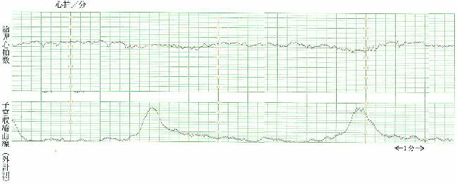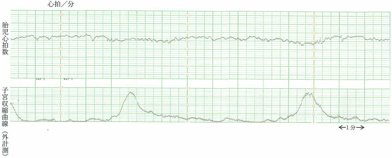 20歳の初産婦。妊娠39週に規則的な陣痛発来で受診し,早朝に入院した。現在までの妊娠経過で異常の指摘はない。入院時所見:意識は清明。身長 155cm,体重 56kg。体温 36.7℃。脈拍 84/分,整。血圧 130/78mmHg。Leopold診察法で胎児は第1頭位であり,児頭は骨盤内に固定していた。内診所見:子宮口開大 4cm,展退度 80%,下降度SP-2cm。少量の性器出血があったが,破水は認めなかった。超音波検査による胎児推定体重は3300gであった。入院後胎児心拍数陣痛モニター下に経過をみていたが,翌朝の内診所見は子宮口開大 6cm,展退度 90%,児頭下降度SP±0cm,未破水であった。その時の胎児心拍数陣痛図を別に示す。