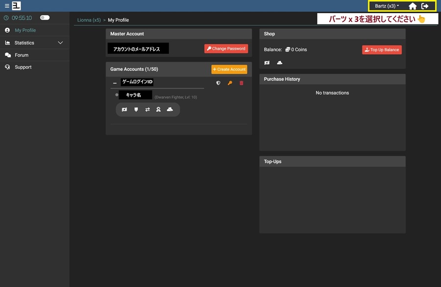 この時、必ず右上のサーバー選択画面で Bartz x3 を選択してください !
