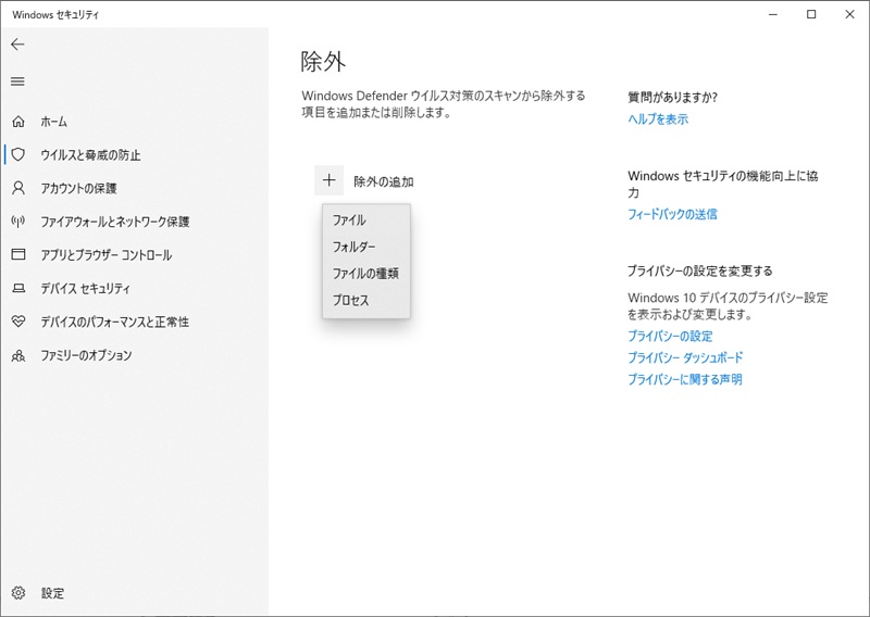 4) 「除外の追加」をクリックし、ニーズに応じて、ファイル、フォルダー、ファイルの種類、またはプロセスを選択し、Windows Defenderによって削除されたくないものを指定します。