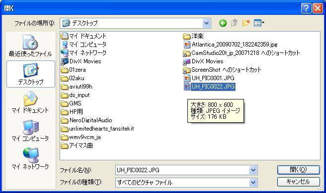 さっきデスクトップに持ってきた画像ファイルを選択します。