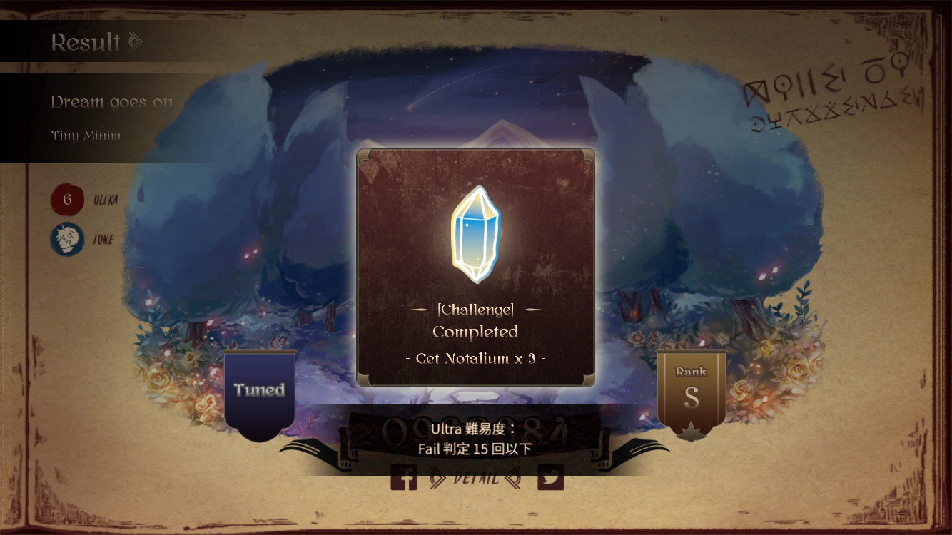 リザルト画面ではスコア、ランクの確認と、twitterや各SNSへのシェアができる。