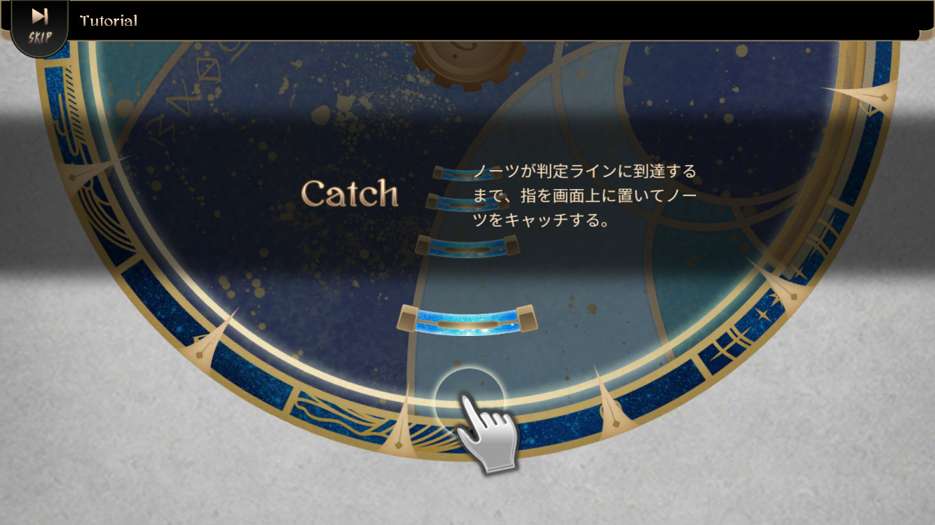 - Catchの亜種。こちらも押すタイミングを図る必要はない。青い線に合わせて動く青いノーツに指を置き続けよう。