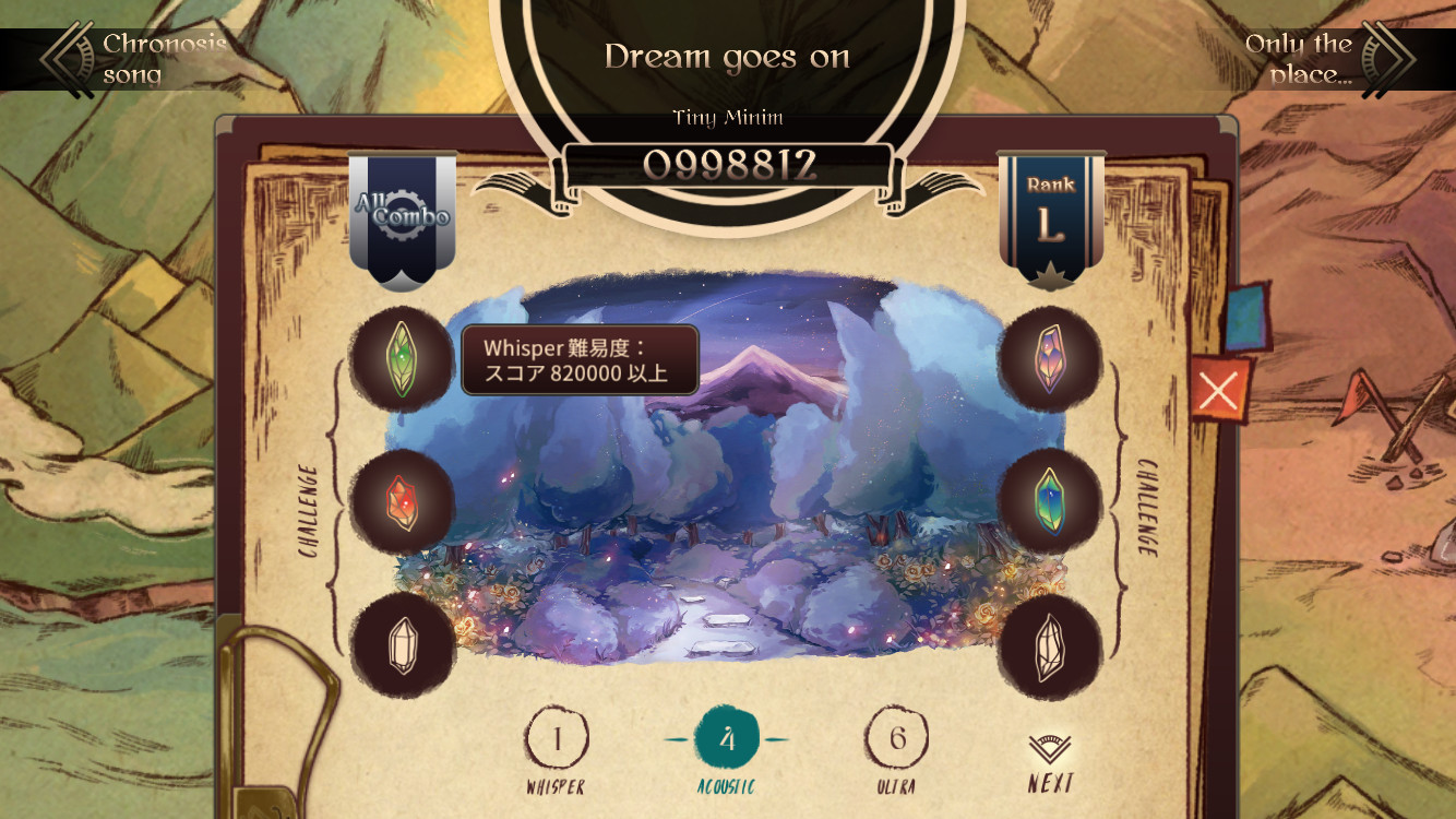 難易度はWhisper、Acoustic、Ultra、隠しのMasterの四段階から選べる。