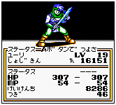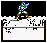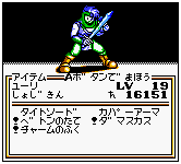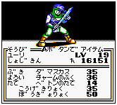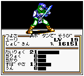 ゲーム中に“ステータス”コマンドでキャラクターを選ぶとそのキャラクターの名前・レベル・しょじきん・ステータスなどが表示されます。 さらにAボタンを押すと、つよさ・そうび・アイテム・まほうの順番で表示されます。