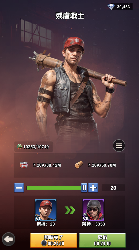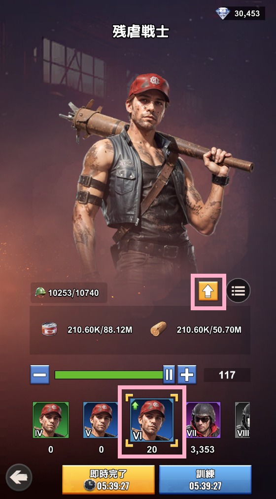 すると青い訓練ボタンが緑の昇格ボタンにかわりますので、それをタップすることで資源が足りていれば昇格訓練が始まります