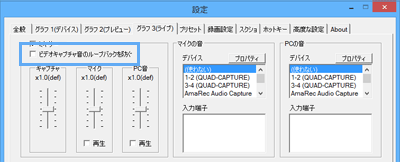 「ビデオキャプチャ音のループバックを防ぐ」のチェックを外します。これはゲームの音が二重になるのを防止するための設定ですが、ONにしているとアマレコTVの設定によってはゲームの音を録音できません。