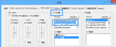 - 設定画面を開き、「グラフ 3(ライブ)」タブで「キャプチャ」と「マイク」のスライダーを上下に動かすと音量調整できます。ゲーム音の「キャプチャ」は「x0.5」または「x0.25」に、「マイク」は「x1.0(def)」または「x1.5」を目安にするとよいでしょう。マイク音量についてはWindows側でも調整が必要です(上述)。