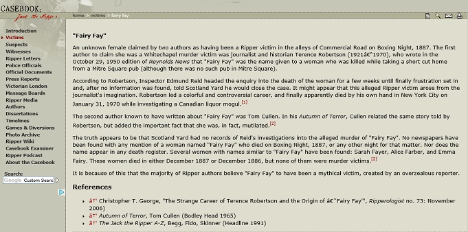 スコットランドヤードの発表によると、レイド警部の捜査記録に「フェアリー・フェイ」という名前の被害者はいない。また、1887年12月26日もしくはそこに近しい日付の夜に「フェアリー・フェイ」が殺害されたという記録はどの新聞記事にも見られなかった。どの死亡記録にも彼女の名前は存在しなかったのだ。サラ・フェイヤー、アリス・ファーバー、エマ・フェアリーといったような似た名前は1886年12月~1887年12月の死亡記録に残されていたが、しかしいずれの女性も殺人事件の被害者ではなかった。