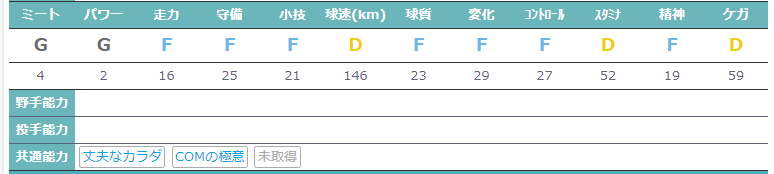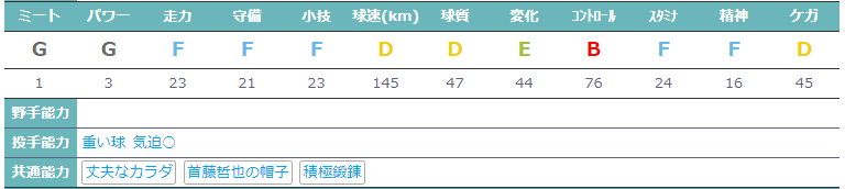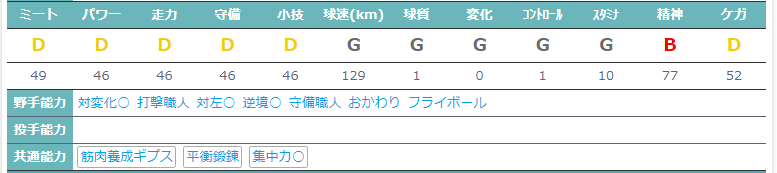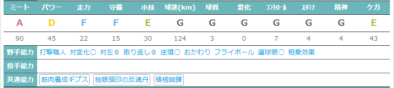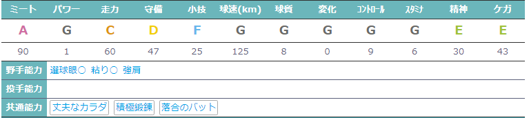 前世から気を取り直して初の野手育成。普通を引いたためまぁまぁ見れるリードオフマン型に。なお水。 |