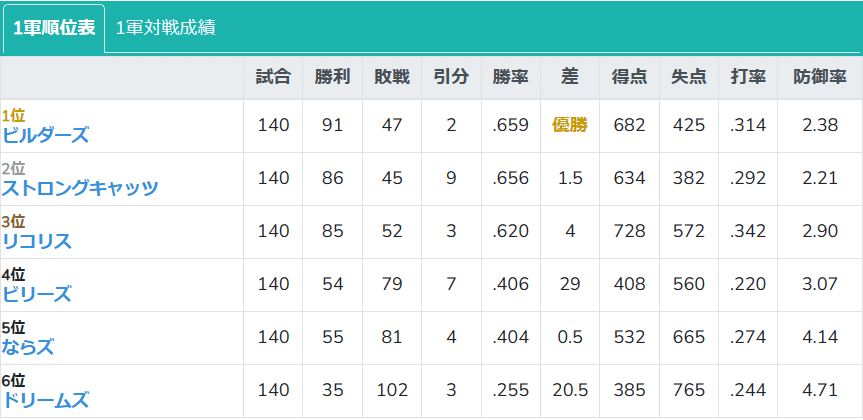 当然ここまで抑える投手陣も素晴らしいが野手陣も素晴らしかった。SBLとは思えないほど守備を極めており、平均守備値は55となる珍しいシーズンであった。 |