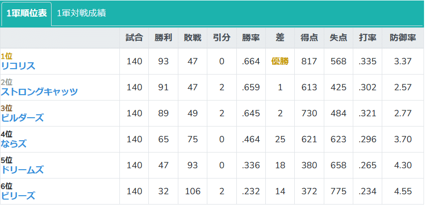 しかし400年度から対馬は勝ち続け優勝まで出来るほど成長した。その陰には色んな選手、コーチ、監督の努力があったーーーーー 頑張ってミーティングルームで話したり補強をしてくれる監督。データベースを作り育成をしやすくしてくれた選手。そしてなにより、ミーティングルームを盛り上げ対馬ストロングキャッツを楽しくて居心地の良いチームにしてくれた皆が、この優勝を導いたのだろう。 万年Bクラスの対馬が優勝したのは充分"珍事件"だということでここに記す。 ![]() |