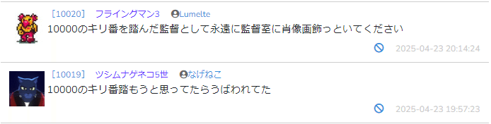 密かにキリ番を狙っていたなげねこオーナー、しかし普段"あばれ"ている男に上手く踏めるはずもなく...結果Lumelte監督が踏むこととなった。