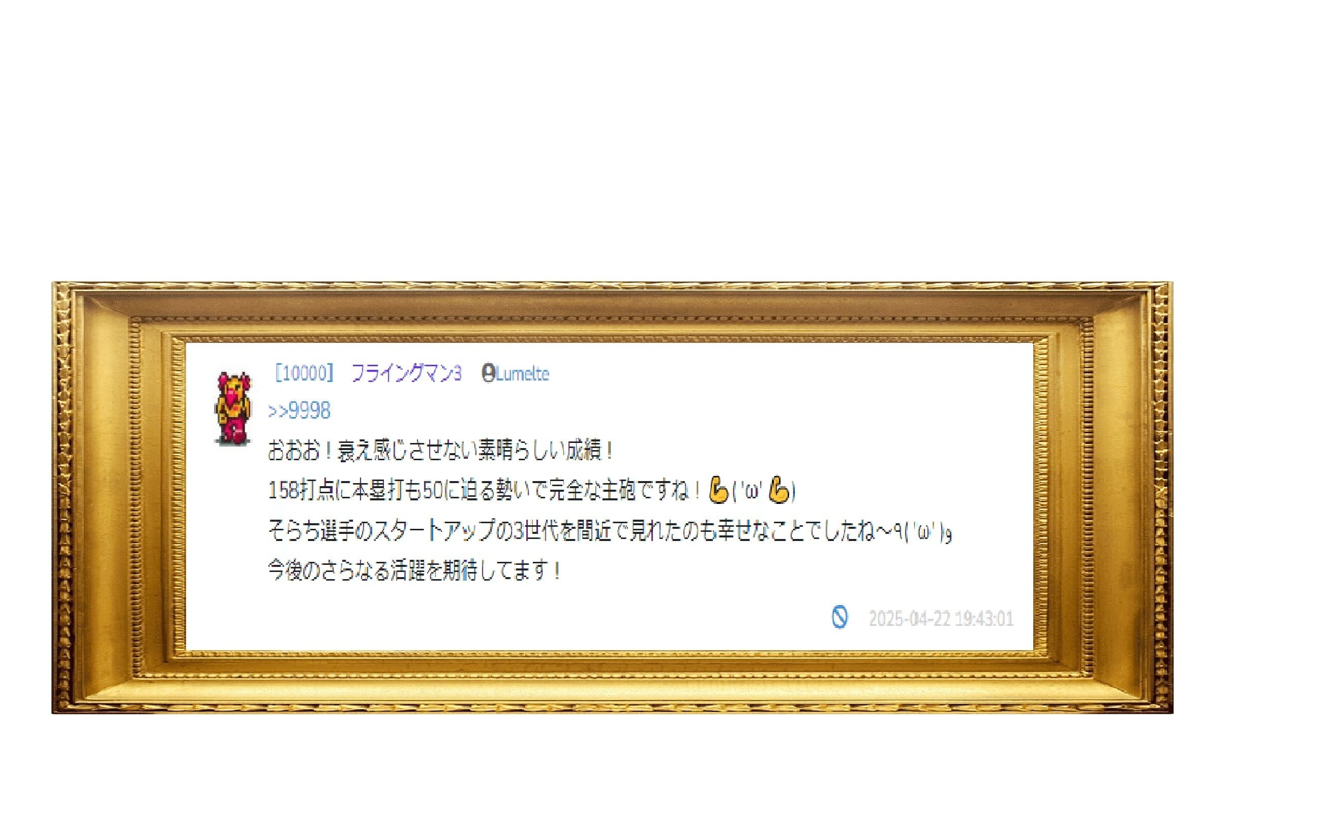 またもナナチ選手に4000レス目を踏まれ、さらに盗塁王を獲得していたokane選手にもスピードで負けたため4002レス目を踏んでしまう。