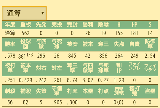 飛び抜けた強みは無いが巧みな投球術でバファローズのブルペンを支えた右腕。全盛期は銭闘でも冬を賑わせた。 |