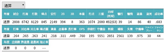 最優秀守備外野手に9度輝いた守備のスペシャリスト。入団当初は守備しか出来ない選手であったが、後に粘り○選球眼○対左○を持つことによりしぶとい打撃を手に入れた。犠打歴代1位、四球歴代2位 |