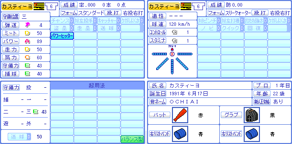 自称史上最高の2番ショート。バランスよく育てることに固執していたが最後ブレる。自称5ツールプレイヤー。BBL界野手初のDCDDDDを達成。ミートDながら3割3回、二桁本塁打7度、20盗塁2回、通算ファインプレーリーグ17位(現在)、通算犠打ランキング271(リーグ1位)、シーズン犠打リーグ1位9回。 |