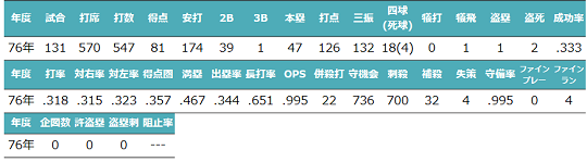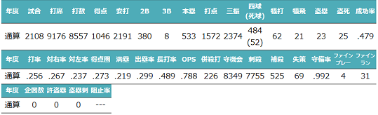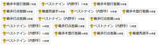 ファイターズ(61-74)スワローズ(75-78)ファイターズ(79) | 13 | 内野手 | 左投左打 | オープン | 61年度~79年度 | ファイターズとスワローズで活躍した内野手。目を見張る長打力が持ち味で70年度には54HR146打点を記録してHR、打点のタイトルだけでなくMVPも受賞。76年度にもMVPに選出されるなど多数のタイトルを獲得。通算でも2191安打533HR1572打点とBBL屈指の長距離砲として名に恥じない成績を残した。 |