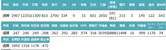 宮城コンドルス(151-171)千葉スカイオーシャンズ(172-173) | 47 | 捕手 | 右投右打 | 振り子 | 151年度~173年度 | コンドルスとスカイオーシャンズでプレーした捕手。鉄壁の守備力と抜群のミート力を兼ね備えた捕手として大活躍した。守備では11回のGG賞、攻撃では首位打者、最多安打、最高出塁率賞を獲得した。通算1176盗塁刺は173年度終了時点で歴代1位である。他にも2790安打145盗塁を記録している。 |
