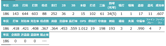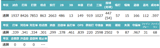 兵庫チーターズ | 9 | 外野手 | 右投右打 | クローズド | 173年度~191年度 | チーターズ一筋の外野手。抜群のミート力で安打を量産したアベレージヒッター。首位打者、最多安打、最高出塁率賞、B9を幾度となく獲得(合計22個)。BBL民をして「マートンの再現率が半端ない!」と言わしめた。通算でも2663安打166盗塁に通算打率.339を記録した。 |