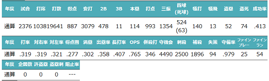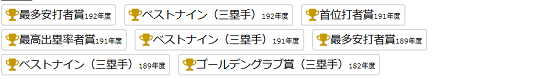 愛知ドルフィンズ(176-192)宮城コンドルス(193-197) | 23 | 内野手 | 右投右打 | スクエア | 173年度~197年度 | ドルフィンズとコンドルスでプレーした内野手。驚異的なミート力を誇るアベレージヒッターとして安打を量産。首位打者、最多安打、最高出塁率、B9などのタイトルを獲得。通算でも3079安打114HRに打率.319を記録した。ちなみに製作者5人目(5人連続)の3000本安打達成選手となる模様。 |