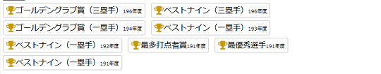 広島レッドフィッシュ(179-194)愛知ドルフィンズ(195-201)大阪ブルーバイソンズ(202-203) | 2 | 内野手 | 右投右打 | オープン | 179年度~203年度 | 3球団を渡り歩いた内野手。優れたパワーと走力を持ち合わせた攻撃的選手として活躍。MVPを始めB9、GG賞、打点王など合計8個のタイトルを獲得。195年度は打率が僅か2厘届かず惜しくもトリプルスリーを逃した(.298 39 31)。通算でも1265得点2428安打423HR1263打点205盗塁を記録した。 |