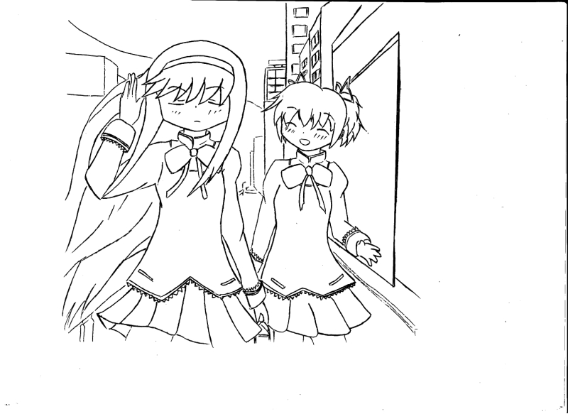 ほむらと連れ添って歩きながら、いつもの合流地点で待っていた親友二人に手を振るまどか