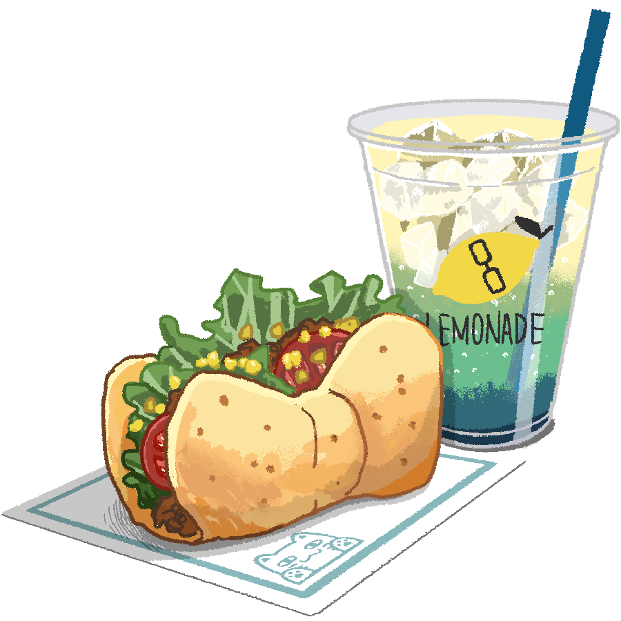 - 長時間の試行錯誤の末作り上げた、食料値と水分値がバランス良く回復する超効率商品、リボンタコスとレモネードがメインとなるセット「Tacos.9132」が看板メニュー。この他、店員の個性にちなんだオリジナルメニューや、参加者の購買欲をそそるイベント限定メニューなどを取り揃え、多くの街の住人から買い求められている。