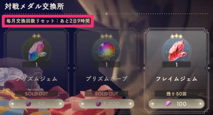 プレイヤーマッチで手に入る対戦メダルも、毎月交換所がリセットされます。こちらもオーブやマジカルバレットは忘れずに毎月交換しておきましょう。