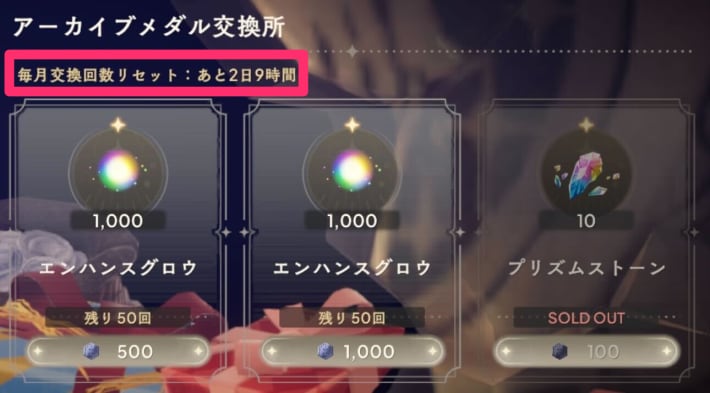 アーカイブ化されたイベントで手に入るアーカイブメダルは、交換所で素材と交換することが出来ます。交換所は毎月リセットされるため、オーブやマジカルバレットなどの入手が限定されている素材は必ず交換しておきましょう。