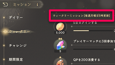 ウィークリーミッションは、毎週月曜AM5:00に達成状況がリセットされます。デイリークエストとプレイヤーマッチをこなしていれば全達成しやすいため、こちらも意識してプレイすることをおすすめします。