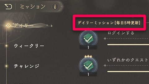デイリーミッションは毎日AM5:00に達成状況がリセットされます。数分程度で全達成可能なため、こちらもできるだけ毎日こなしておきましょう。