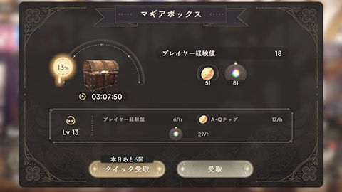 Point! | クイック受取ではプレイヤーLv.経験値の獲得ができません。プレイヤーLv.経験値もマギアボックスで受け取りたい場合は、時間経過で貯まった分を通常受取しましょう。 |