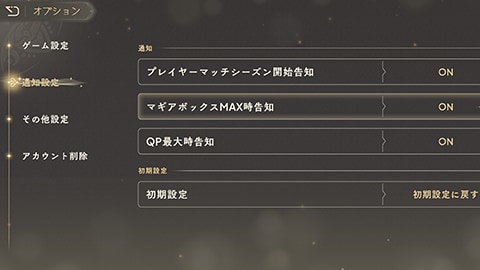 オプション画面「通知設定」で、マギアボックスが上限までストックされたタイミングに通知が来るように設定することができます。受取り忘れを防ぐために、この項目がONになっているか確認しておきましょう。
