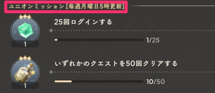 ユニオンミッションも、ウィークリーミッション同様毎週月曜AM5:00に達成状況がリセットされます。自分だけでは無くユニオンメンバー全員で進めるミッションとなっているため、人数が多いユニオンほど進めやすいです。