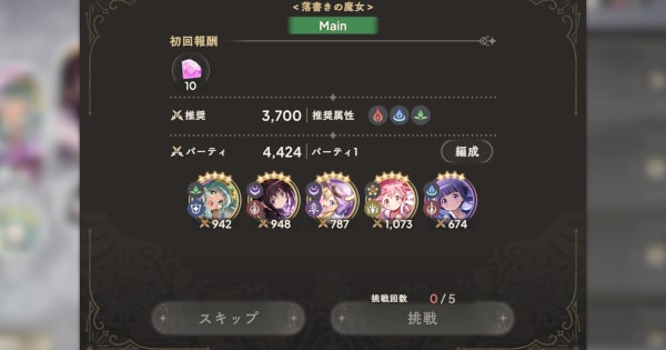 一度クリアしたクエストは、スキップ機能を使って一気に5回までクリアすることが出来ます。スキップできるのは直前にクリアした編成のみなので、挑戦するパーティを入れ替えた場合は、再度クリアする必要があります。