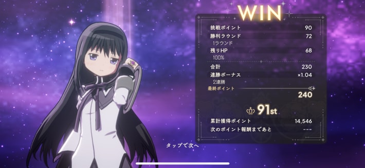 勝利時のラウンド数やキャラの残りHPによってもポイントが手に入ります。そのため、同じ勝利でも圧勝か辛勝かで獲得ポイントに大きな差が生じます。