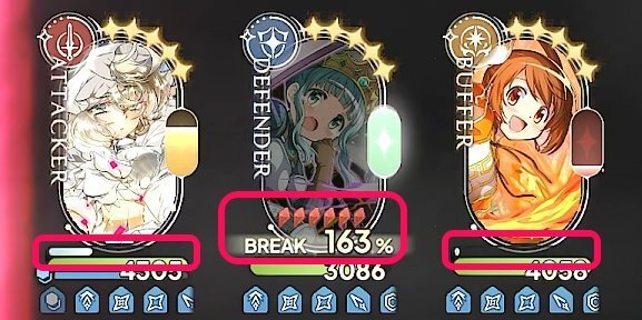 通常のストーリー攻略とは異なり自身が使用するキャラにブレイクゲージが追加されます。ゲージ量はレア度やロールによって異なりますが、ブレイクの仕様については通常の戦闘と同じです。