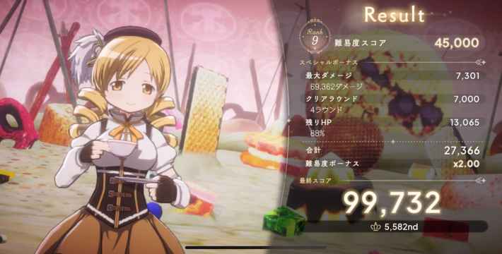 (最大ダメージ+クリアラウンド数+残りHP) × 難易度ボーナス + 難易度スコア |