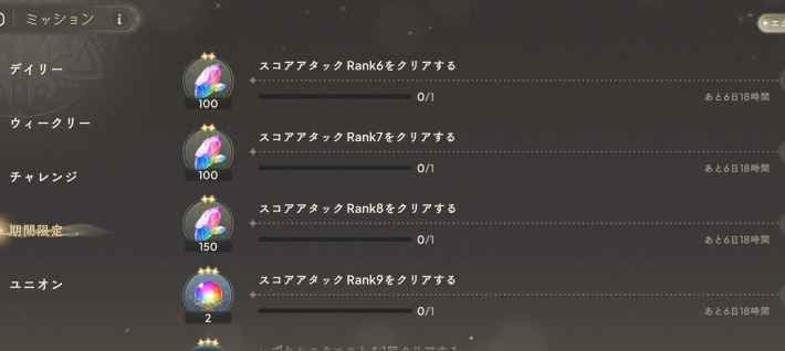 4/7にスコアアタックに関連したミッションが追加されました。ミッション追加前にクリアしていても、クリア扱いにはならないため再度クリアする必要があります。また、上位難易度をクリアしても、下位難易度のクリア判定にはならないので、Rankごとにクリアしていきましょう。