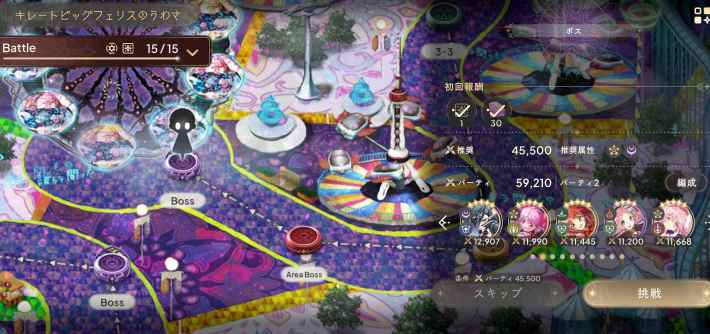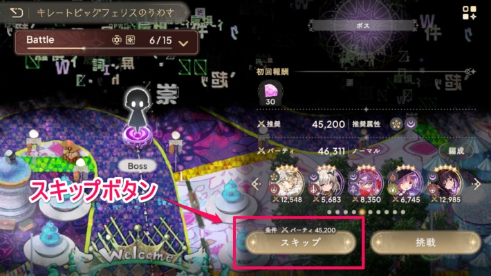 バトルモードのみ編成中のパーティ戦力がステージの推奨戦力を超えていればボスであってもスキップが可能。推奨戦力さえ超えていればどのような編成でもクリア可能なため、未育成キャラの経験値稼ぎをしながら進めることもできます。