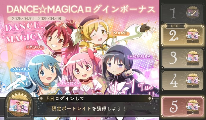 イベント期間中のログインボーナスで★5ポートレイト「DANCE☆MAGICA」が配布されます。イベント期間中に毎日ログインすることで、合計6枚(最終日は2枚)入手できるため、完凸まで強化することが可能です。