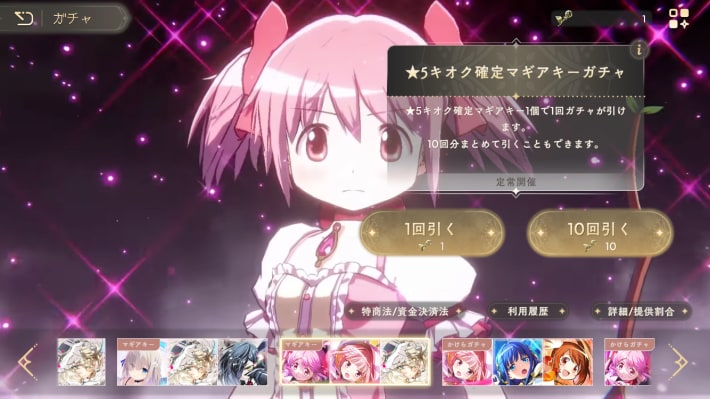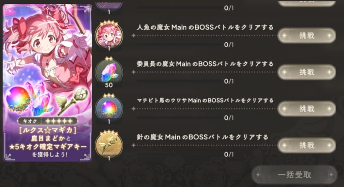 魔法少女まどか☆マギカ scene0の開催を記念した、1日1回無料ガチャが開催。1回引くごとにキオクメダル(銅)を1枚入手可能。このメダルを15枚集めることで、専用の交換所で星5確定マギアキーと交換することができます。