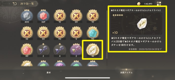 エクセドラパスで獲得した★5確定マギアキーのかけらと、イベントクエストで獲得したかけらは併用できないので注意しましょう。