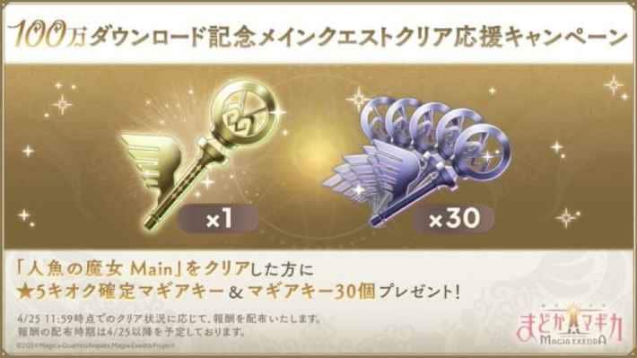 4月25日(金)11:59までに「人魚の魔女(Main)」をクリアした方には、★5確定マギアキーとマギアキー30個がプレゼントされます。これらのアイテムは4/28(月)12時以降に順次配布されます。