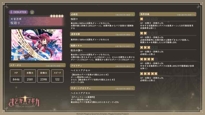 [桜語り]天音月咲は光属性の全体デバッファーです。敵全体に被ダメージ上昇や防御力減少が可能なほか、バフ解除で敵のバリアやシールドの無効化も狙えます。