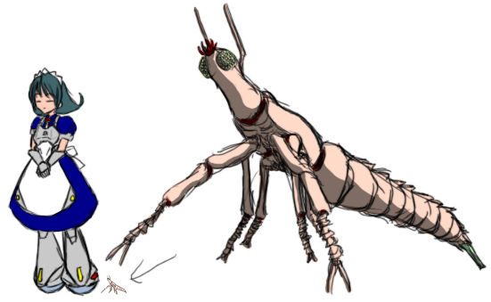 フライよりも更に巨大な体躯を誇る飛行型G。俗称「デビルニードル」。俊敏さにおいてはフライに及ばないものの、それを補って余りあるほどの頑強さとパワーを有する。強靭な顎は戦闘機を容易く噛み砕き、外皮は機銃では傷すら付かない。また、長大な尾は振り回すだけで衝撃波を発生させる。絶対数はフライよりも少ないもののその戦闘力は数倍になるため、空戦メイドにとってもかなりの脅威。モデルはトンボ。