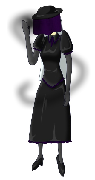 喪服に身を包み、長く白い髪以外に唯一露出する素顔からは真紅の瞳が覗いている。
